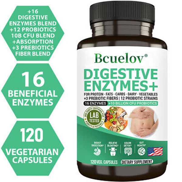 Bcuelov Digestive Enzymes+ is a comprehensive digestive health supplement formulated to enhance digestion, support gut balance, and promote overall well-being. Featuring a powerful blend of digestive enzymes, prebiotics, and probiotics, it helps alleviate bloating, gas, and digestive discomfort, making mealtime more enjoyable.