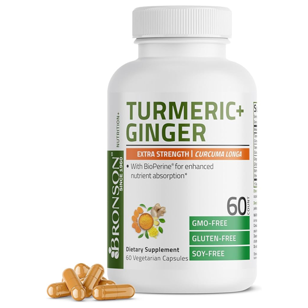Bronson turmeric + ginger extra strength capsules combine the powerful antioxidant and anti-inflammatory properties of turmeric and ginger to support joint health, digestion, and overall wellness. This extra-strength formula enhances nutrient absorption and effectiveness, making it a premium choice for daily health support.