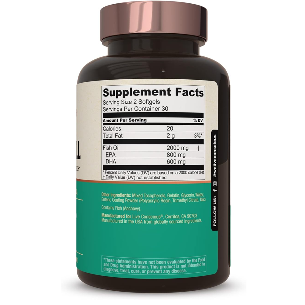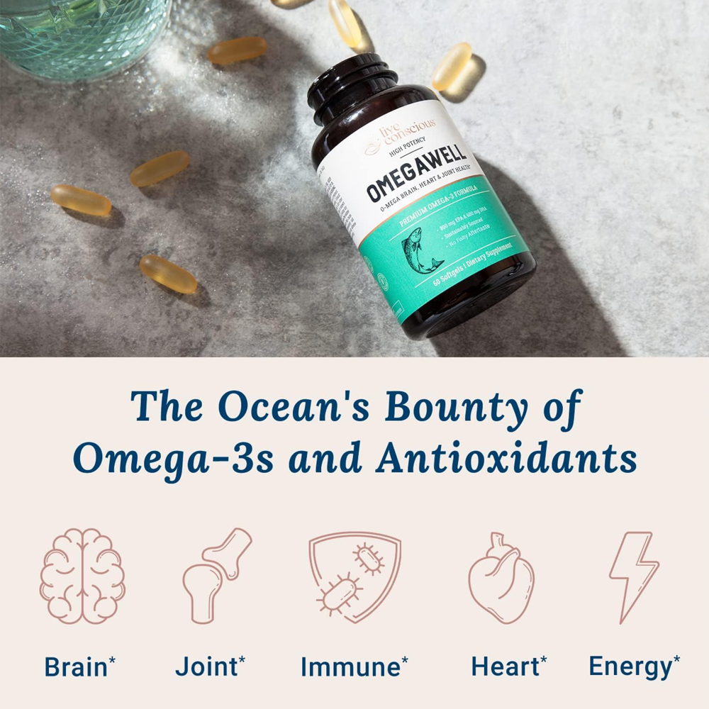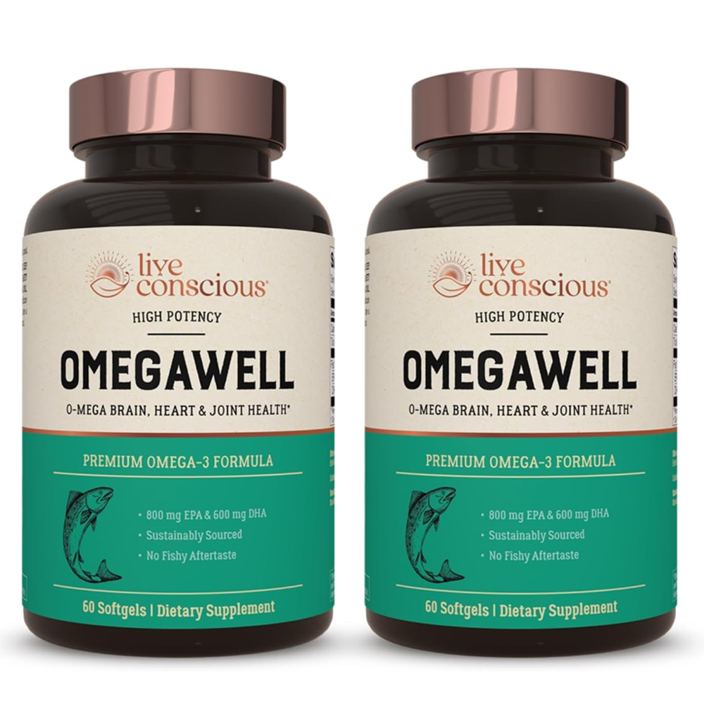 Live Conscious Omegawell is a high-potency Omega-3 fish oil supplement designed to support heart, brain, and joint health. Each serving provides a pure, potent dose of 800mg EPA and 600mg DHA, ensuring optimal wellness benefits. The burpless softgels are enteric-coated to prevent fishy aftertaste and enhance absorption.