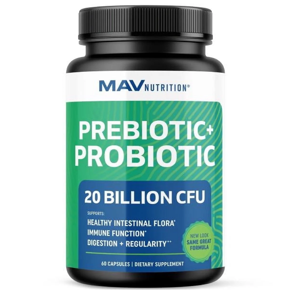Mav nutrition prebiotic + probiotic combines 20 billion cfu of probiotics with prebiotics to support a healthy gut, digestion, and immune system. This powerful synbiotic formula helps nourish beneficial bacteria, reduce bloating, and improve nutrient absorption for overall well-being.