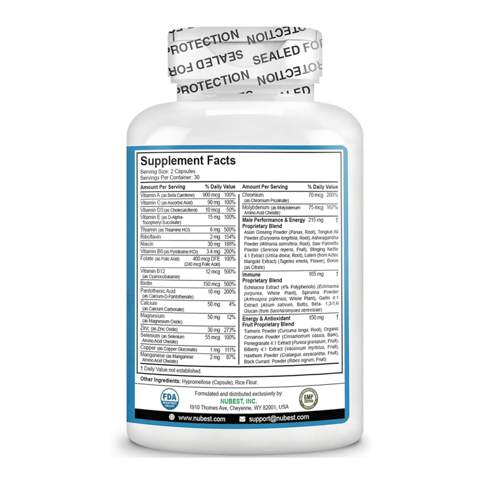 NuBest Men's Multi is an advanced daily multivitamin designed to support men's overall health, boost energy levels, and enhance immunity. With a powerful blend of 20+ essential vitamins, minerals, and herbal extracts, this formula helps fill nutritional gaps and promote vitality for an active lifestyle.