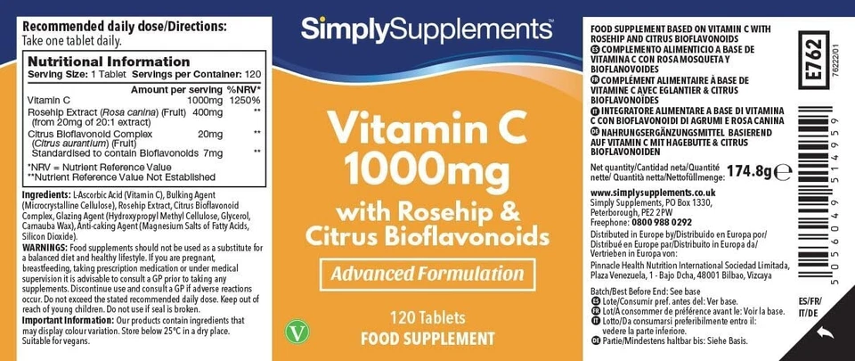 Simply Supplements Vitamin C 1000mg with Rosehip & Citrus Bioflavonoids – 120 Tablets in Pakistan