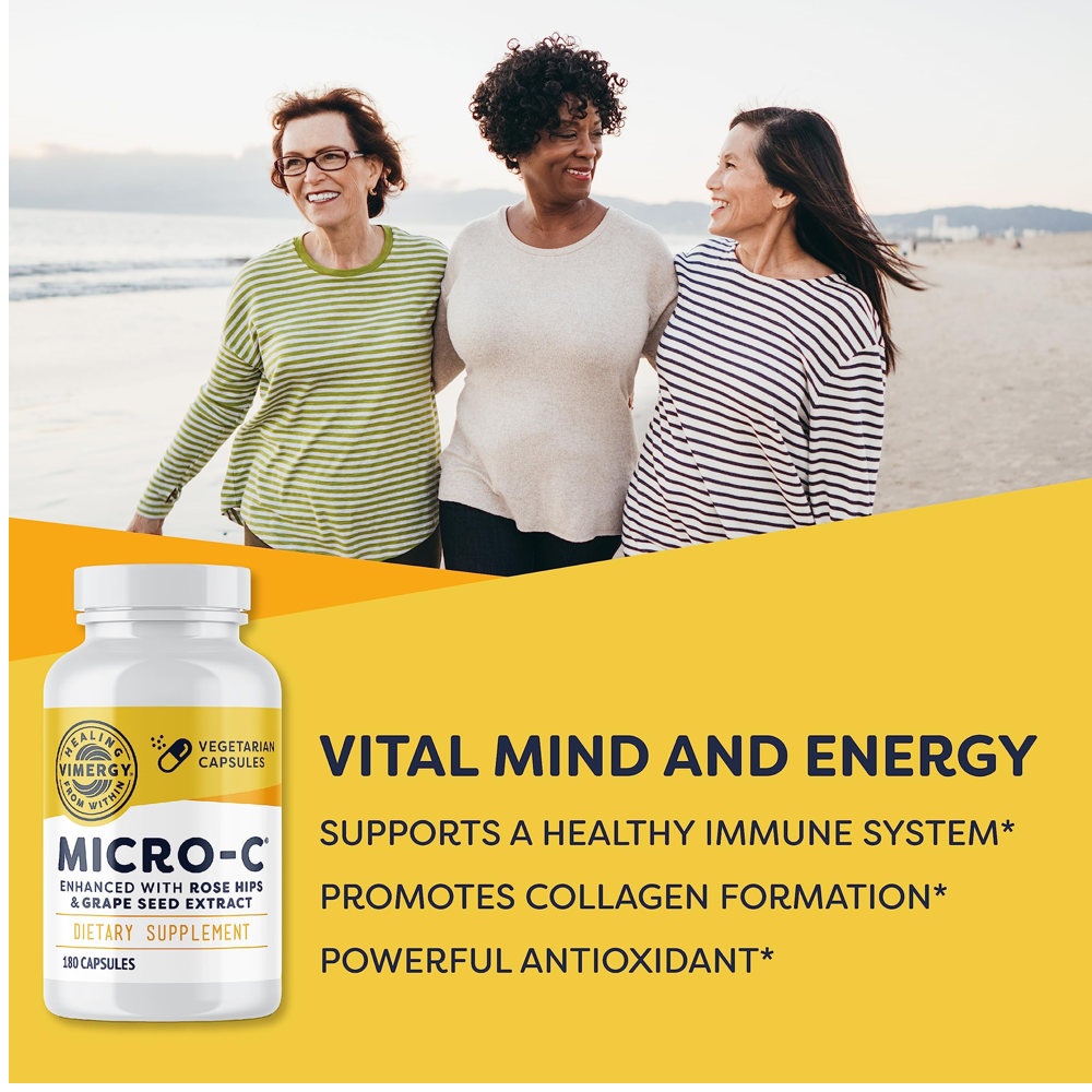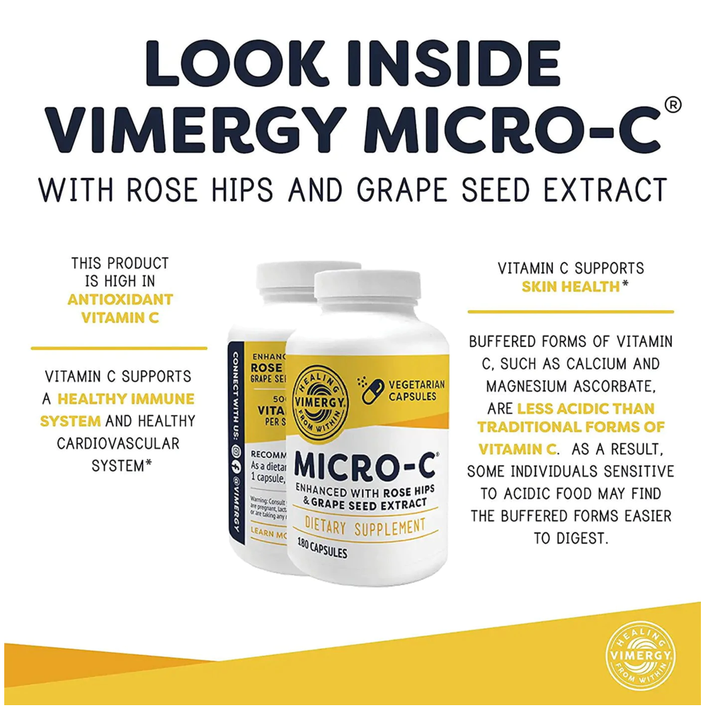 Gentle, High-Absorption Vitamin C for Immune Support Vimergy. Micro-C Capsules provide 500mg of buffered Vitamin C per serving, formulated for enhanced absorption and digestive comfort. This natural blend supports immune health, collagen production, and antioxidant protection while being gentle on the stomach.