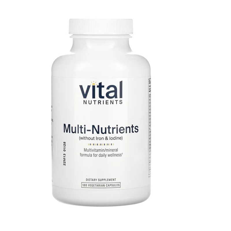 Vital Nutrients Multi-Nutrients is a comprehensive multivitamin and mineral formula designed for daily wellness without iron or iodine. It provides balanced nutritional support to help meet everyday dietary needs and is suitable for individuals who prefer or require an iron- and iodine-free option. Vegetarian capsules make it easy to include in a daily routine.